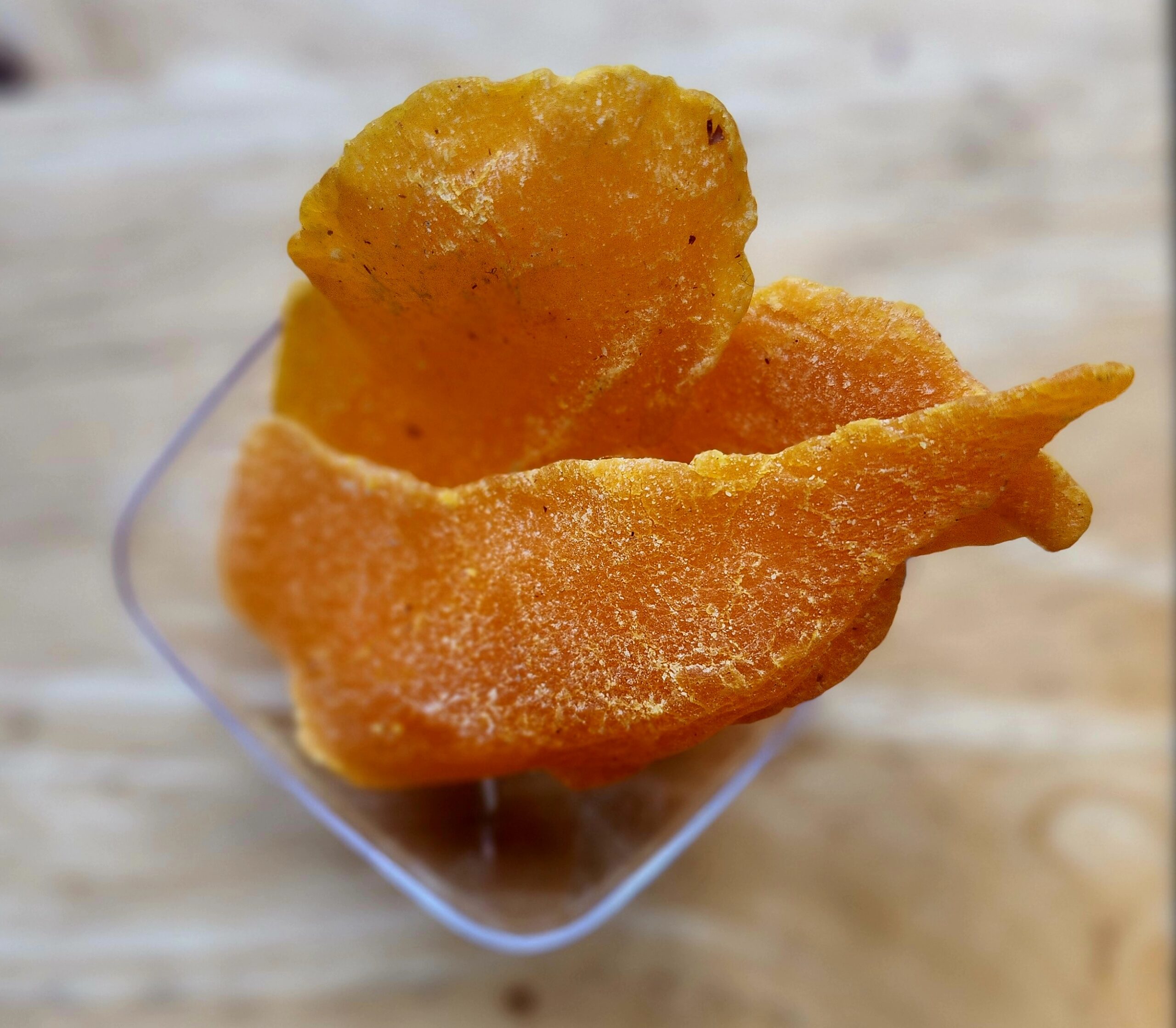 Estos productos son preparados desde el fruto fresco y maduro, el cual ha sido pelado y posteriormente deshidratado a través de aire caliente, luego es sulfatado, calcificado para su firmeza y endulzado con azúcar o almíbar de maíz.
